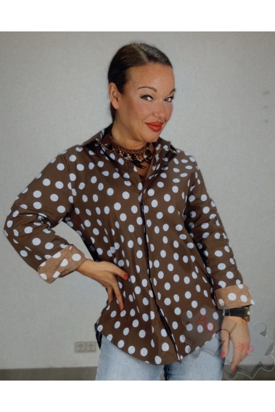Camisa de lunares en tono marrón con lunar azul cielo , disponible en talla única