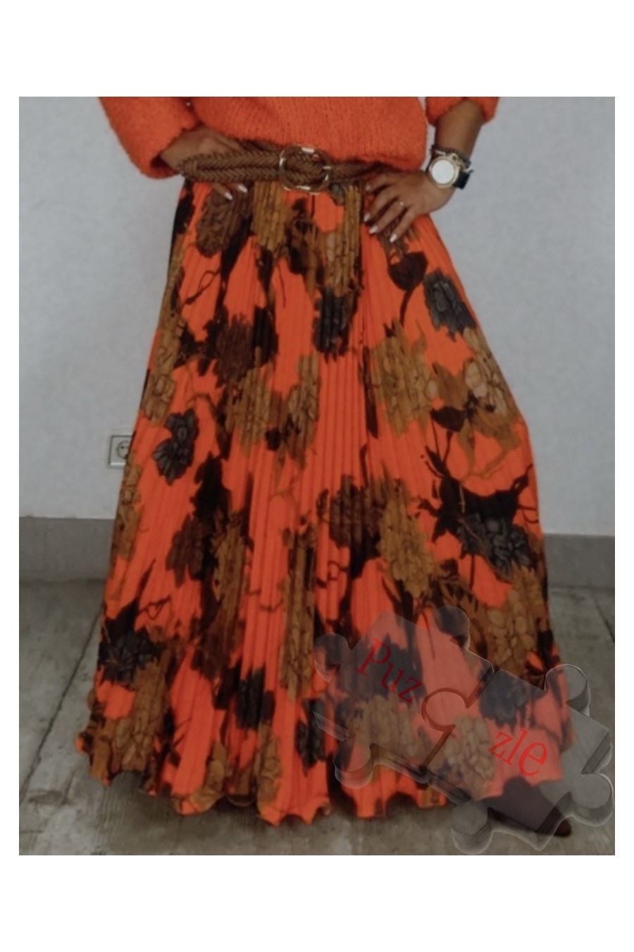 Falda plisada en tono naranja con flores marrones, disponible en talla única