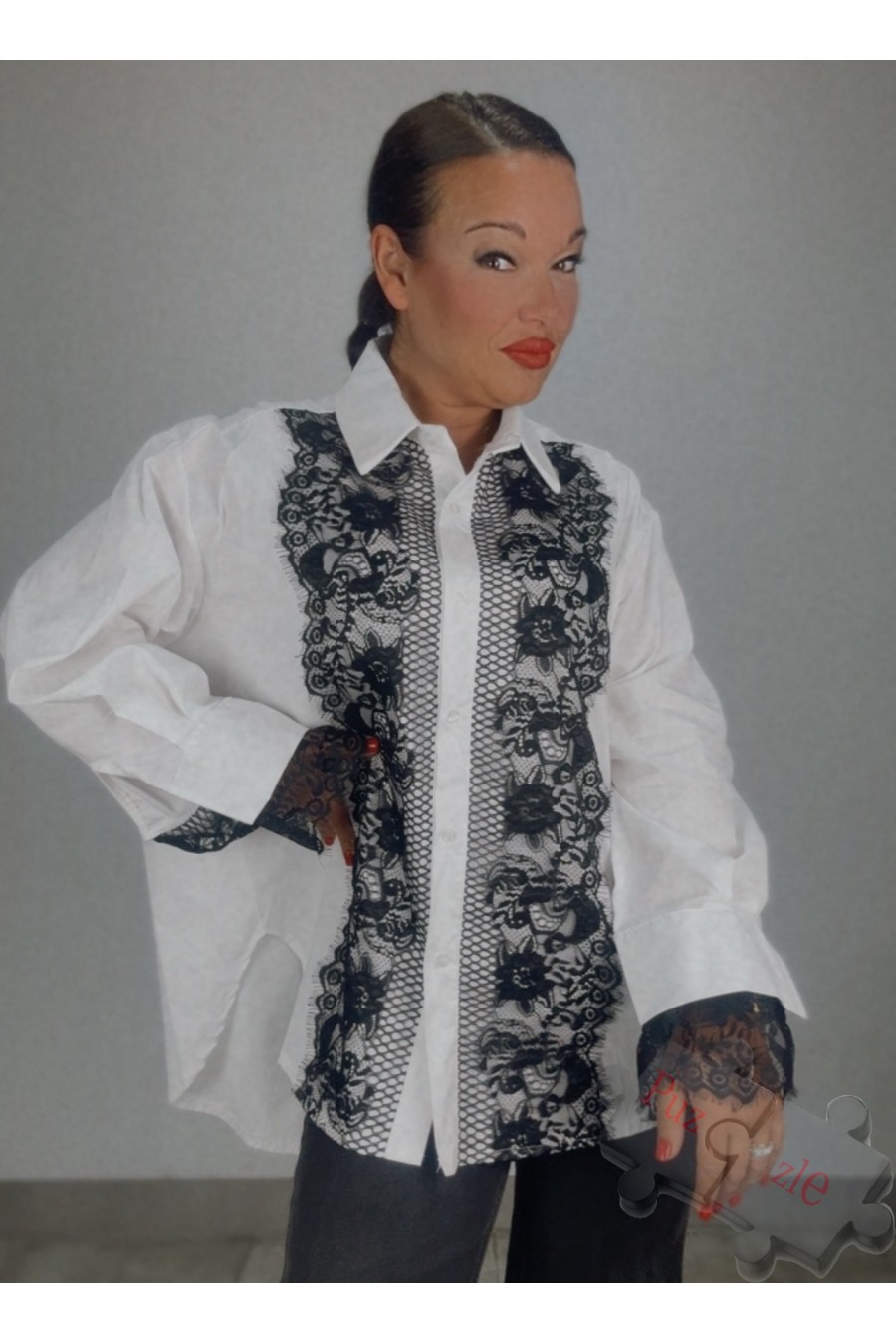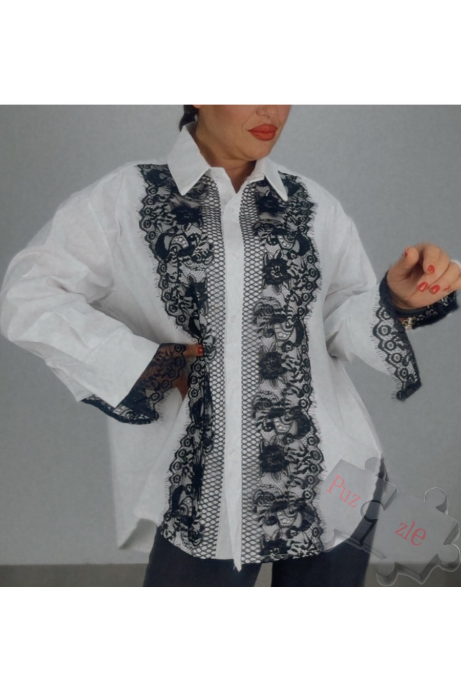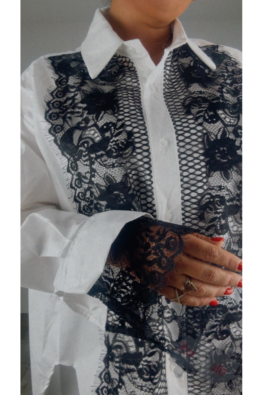 Camisa en blanco con detalles de encaje en negro , disponible en talla única