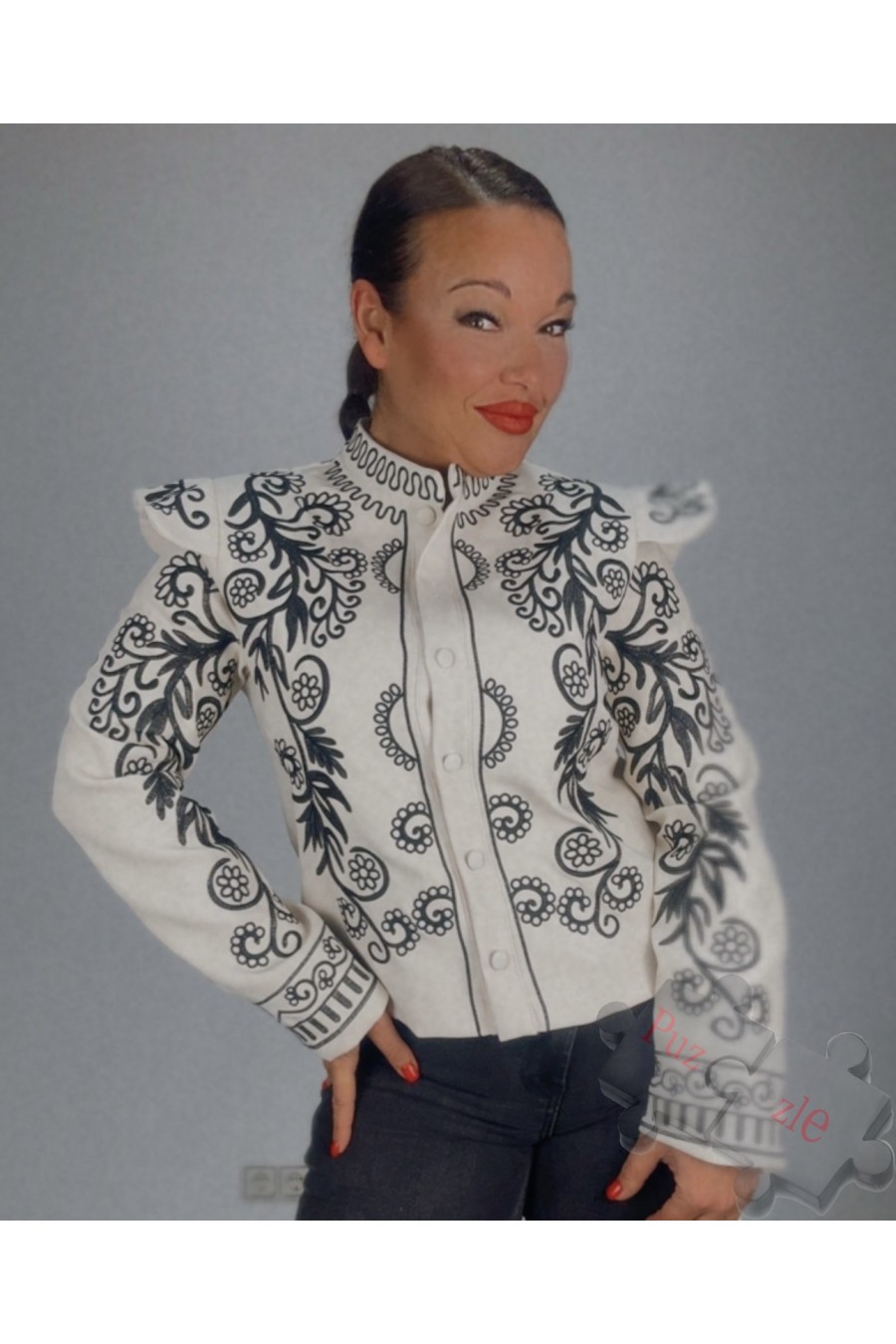 Chaqueta en tono crudo con bordados en tono negro , disponible en 4 tallas