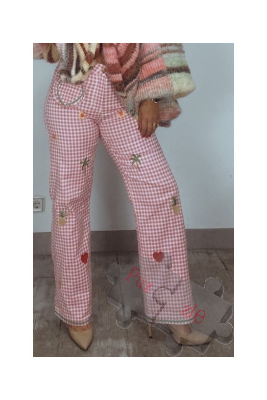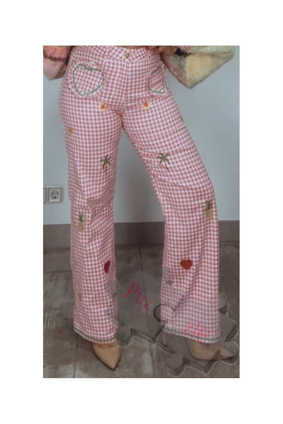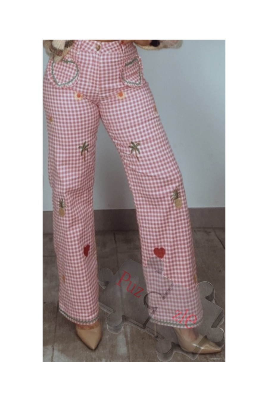 Pantalón tejano con bordados de punto de cruz , disponible en tallas