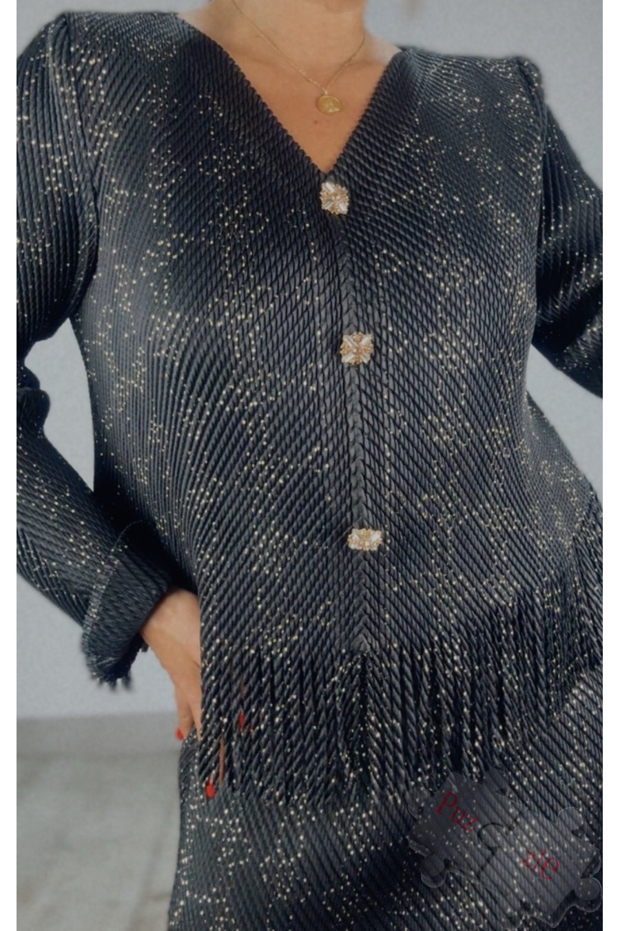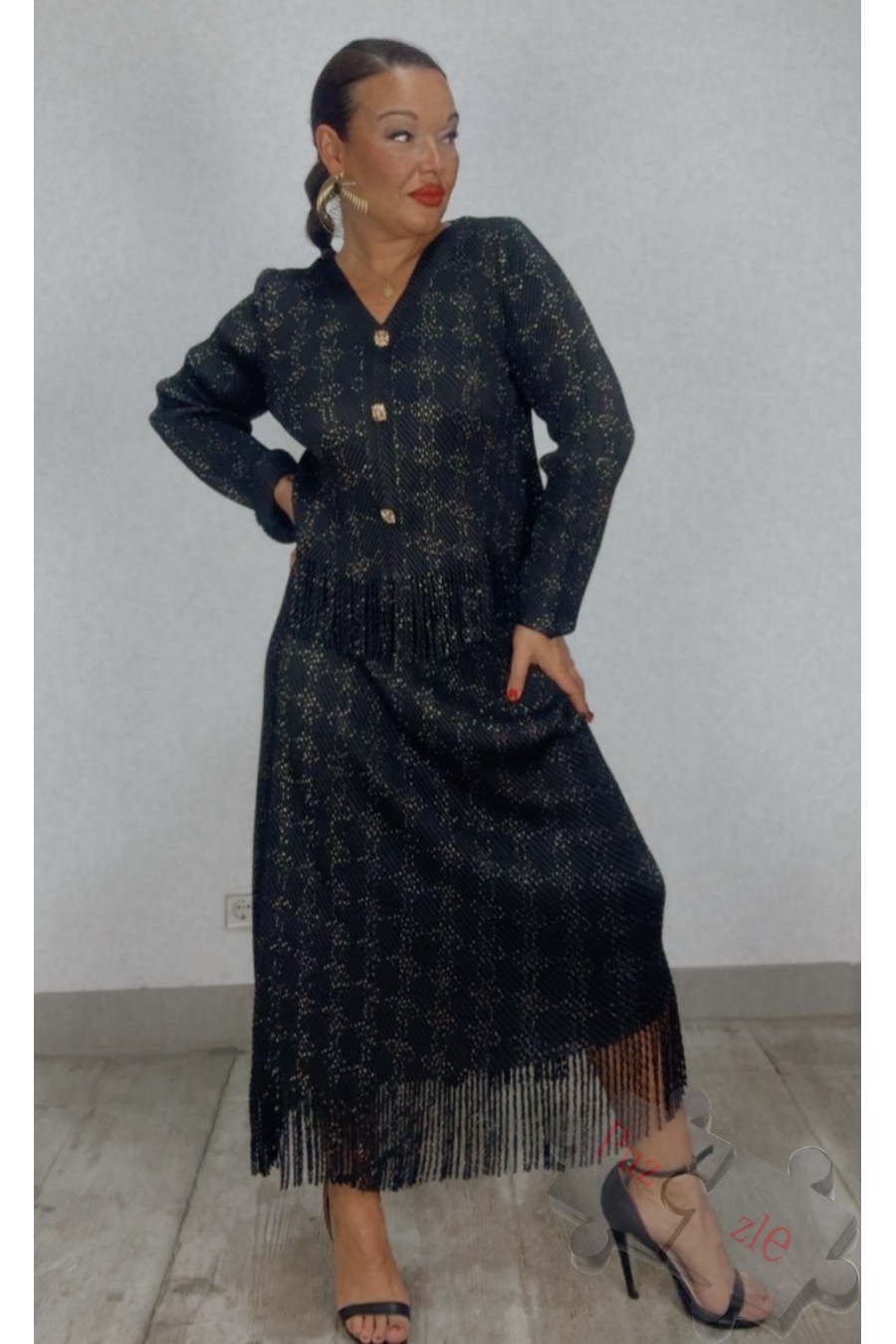 Vestido de tejido acordeón en tono negro con pinceladas en tono dorado, disponible en talla única que oscila desde la talla 38 a 54 sin problemas y sin marcar