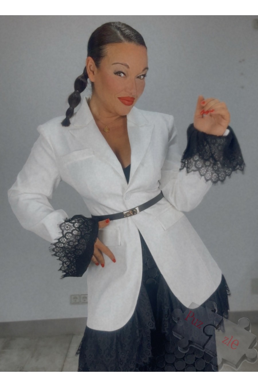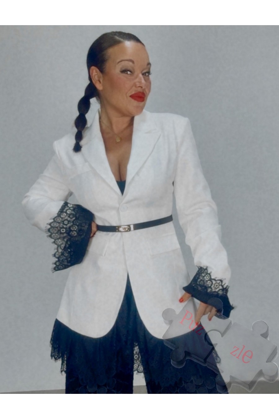 Chaqueta en tono blanco de crepé con mangas y bajos en encaje negro , disponible en talla unica