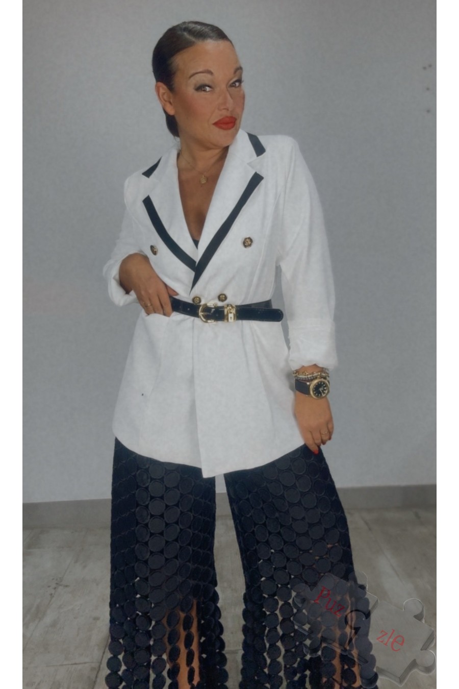 Conjunto de pantalon y chaqueta en negro con bordados dorados , disponible en talla única