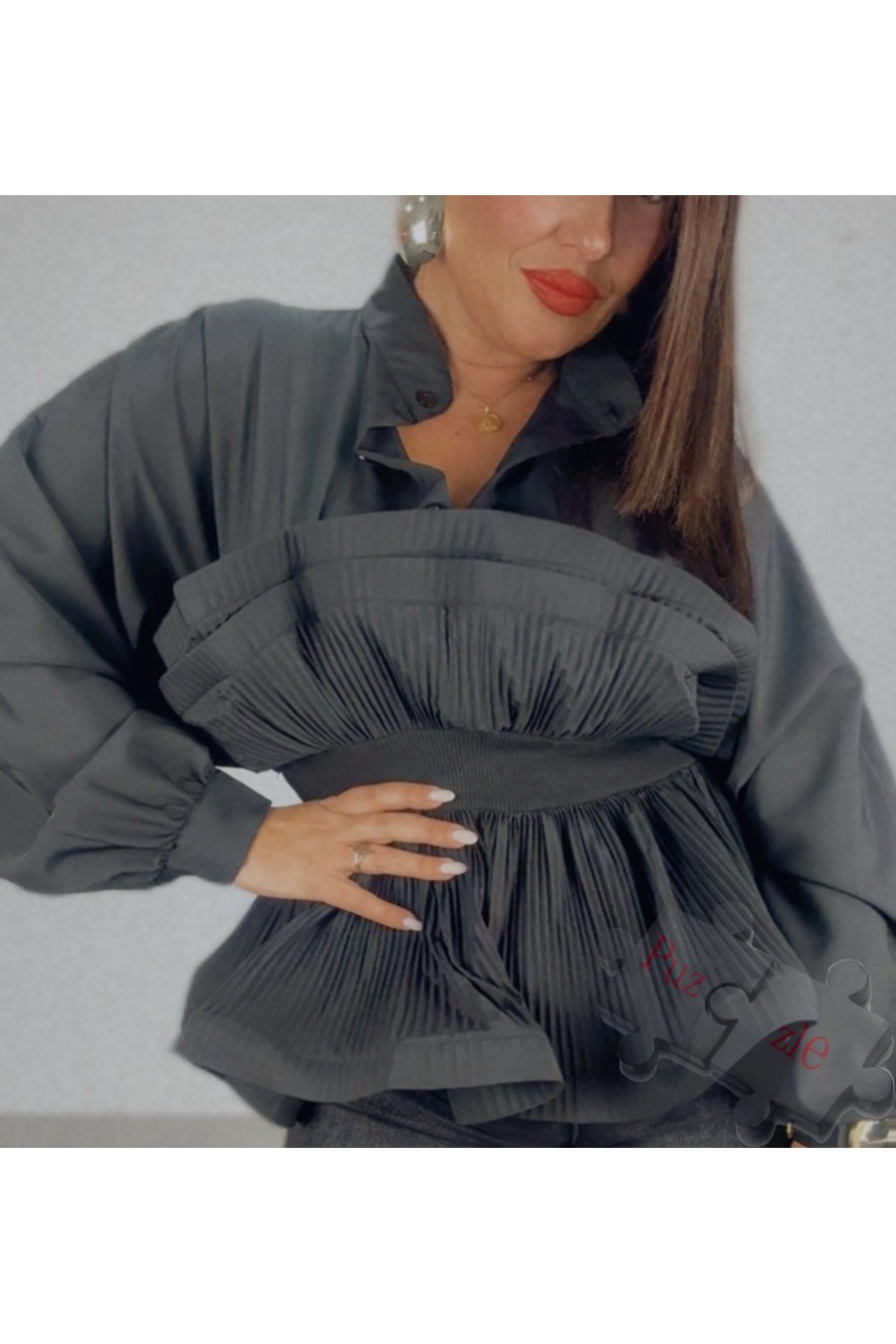 Camisa en tono negro con volante plisado en cintura , disponible en talla única