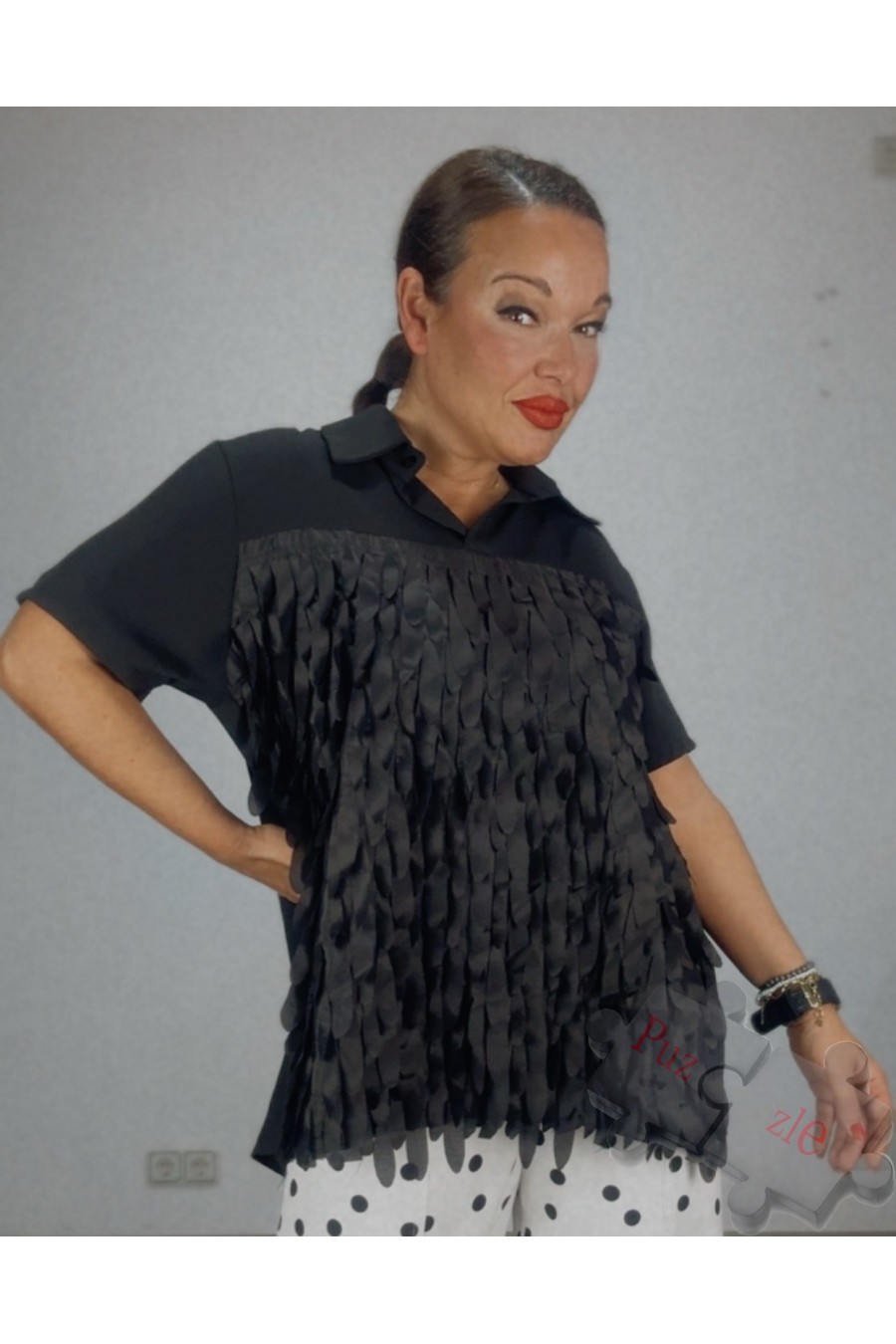 Camisa en tono negro con detalles de flecos en la parte delantera