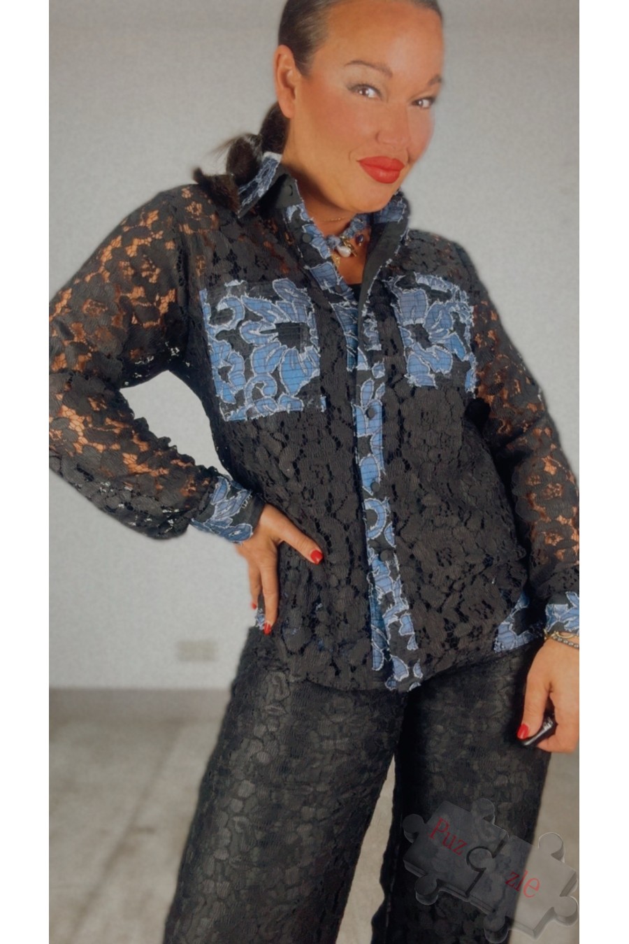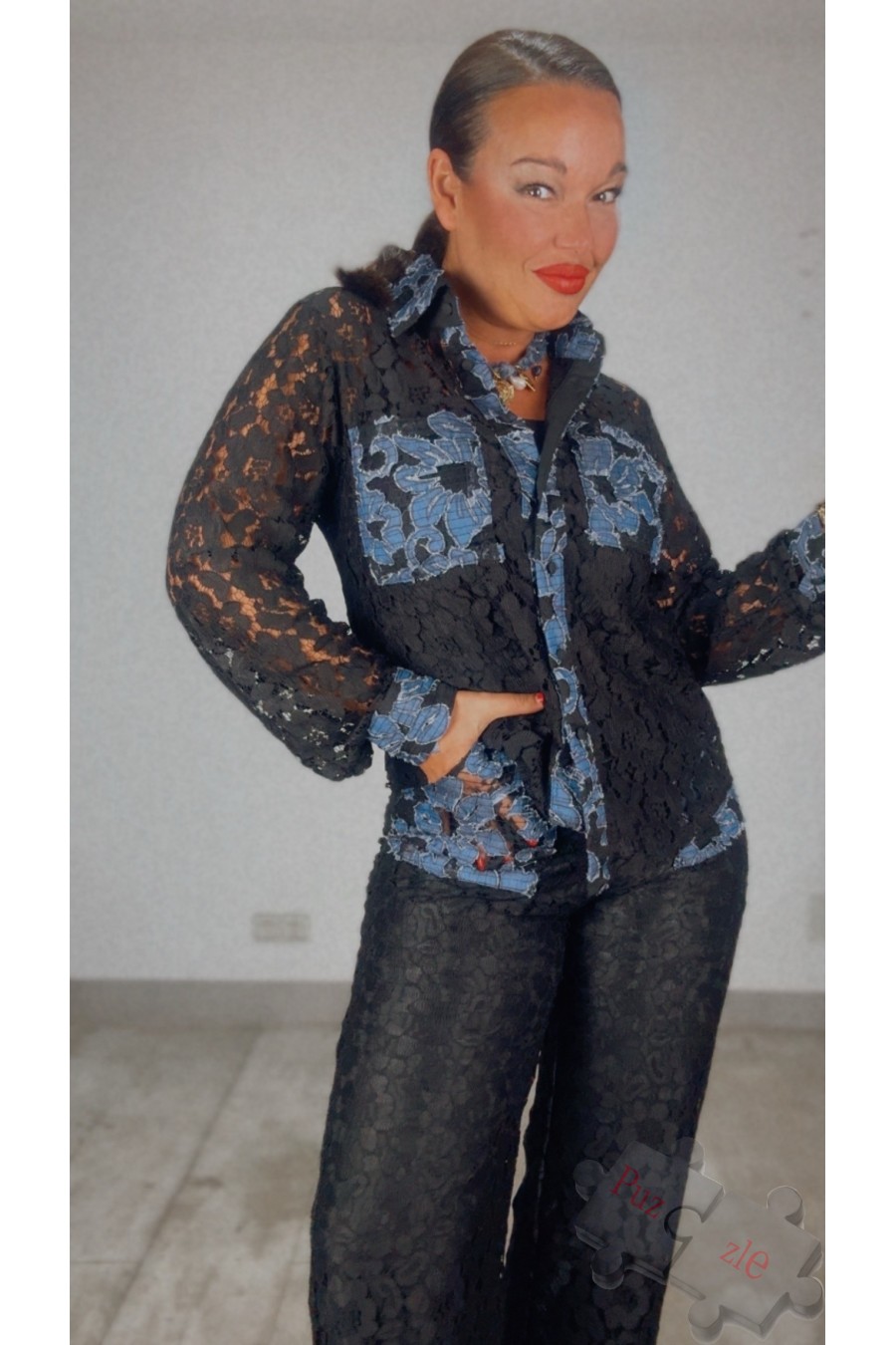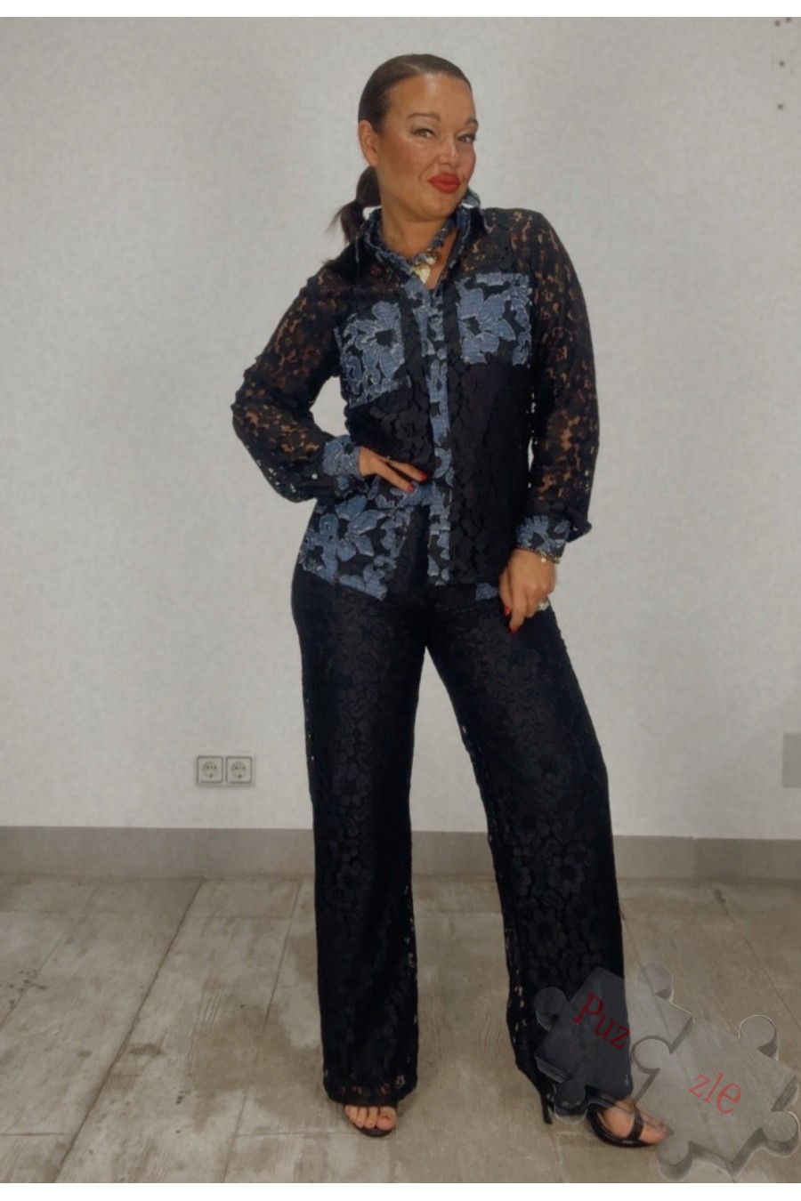 Conjunto de encaje con denim , disponible en tres tallas