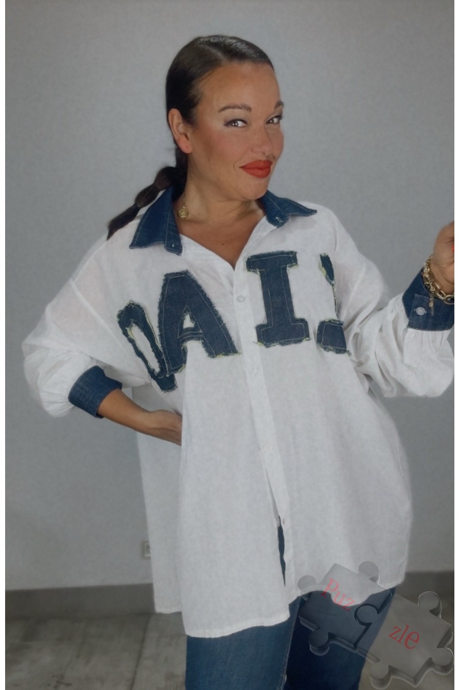 Camisa blanca con detalles en denim, disponible en talla única