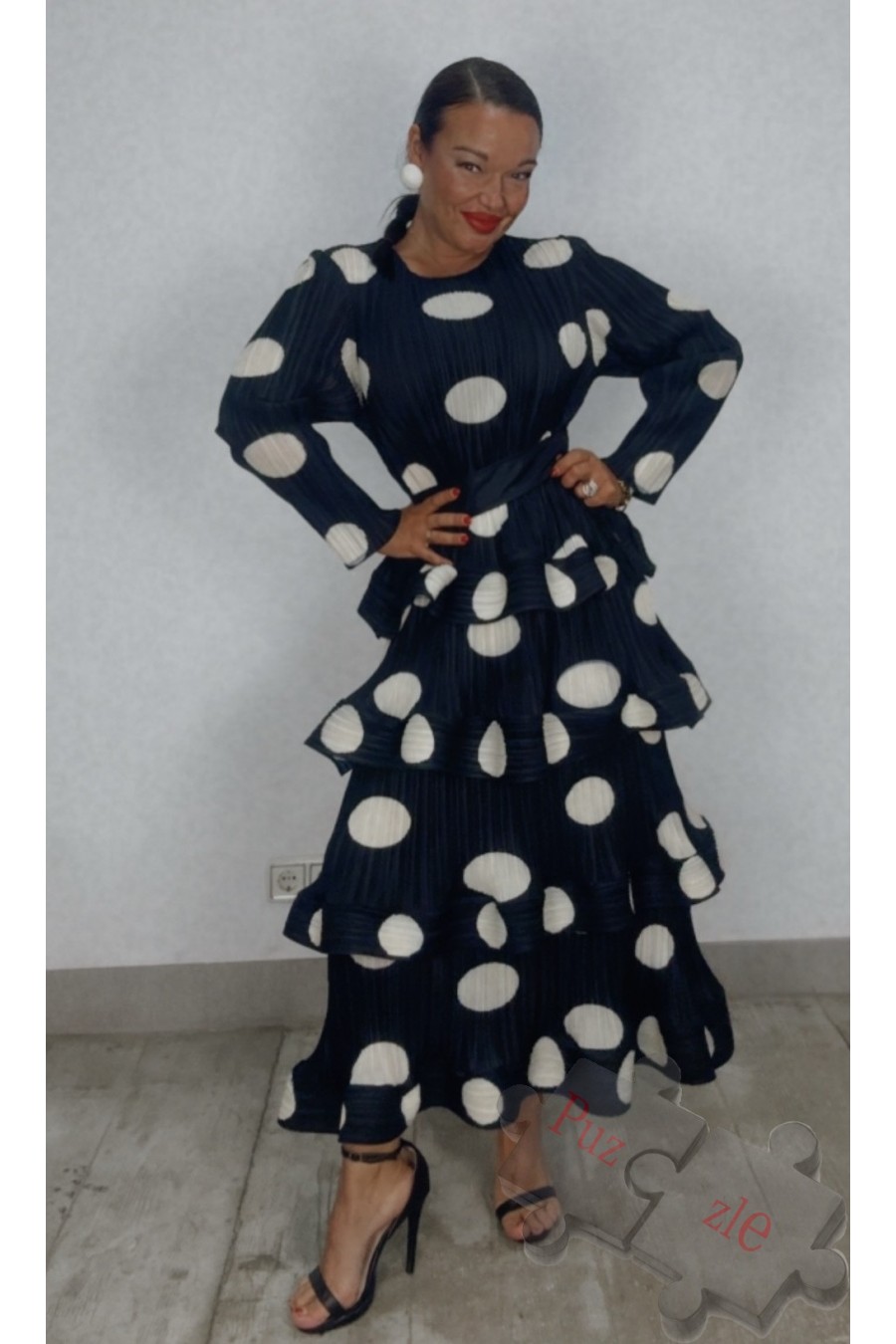 Vestido de tejido acordeón en negro con lunar en blanco , disponible en talla única, se adapta perfectamente desde la talla 38/40 a 50/52
