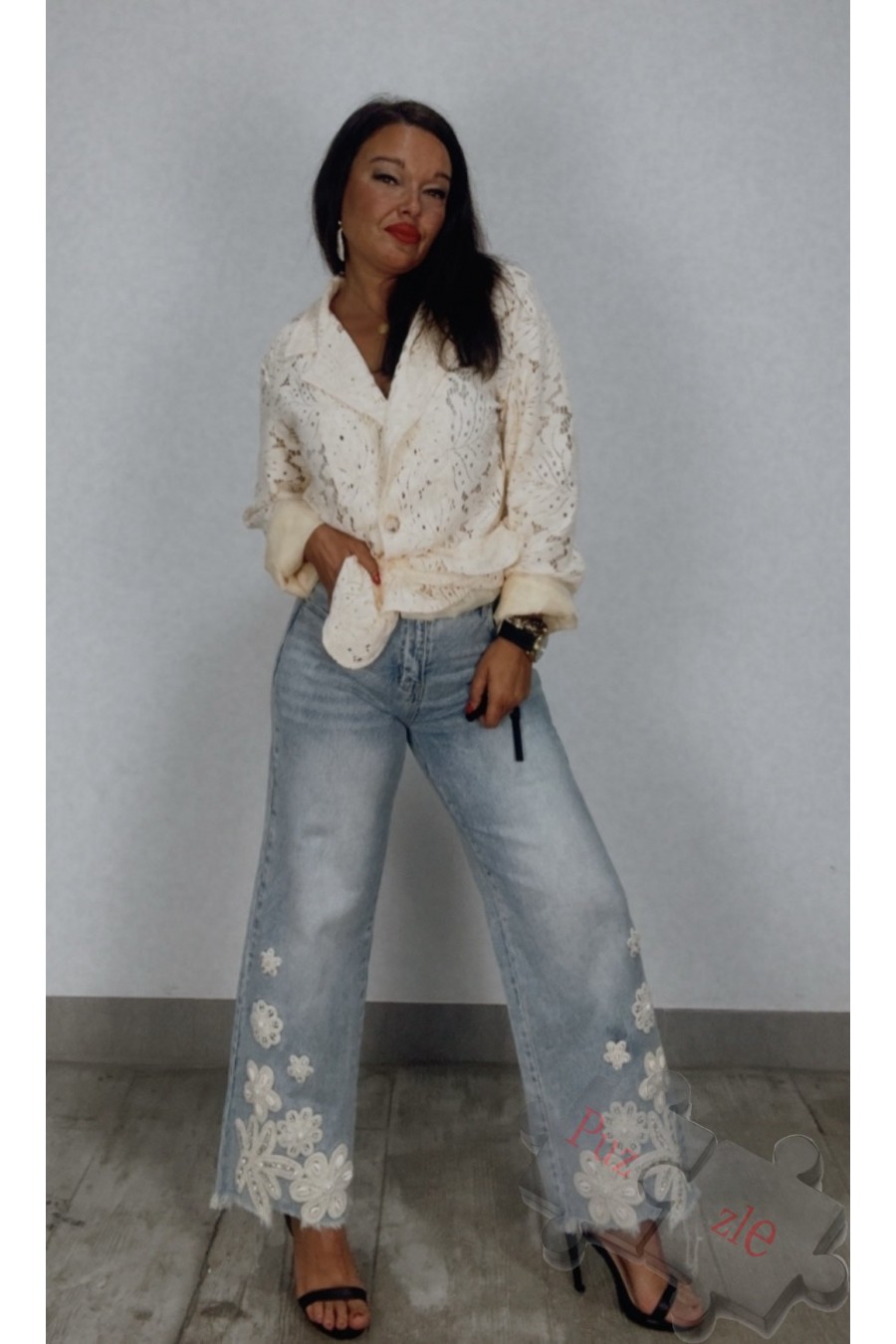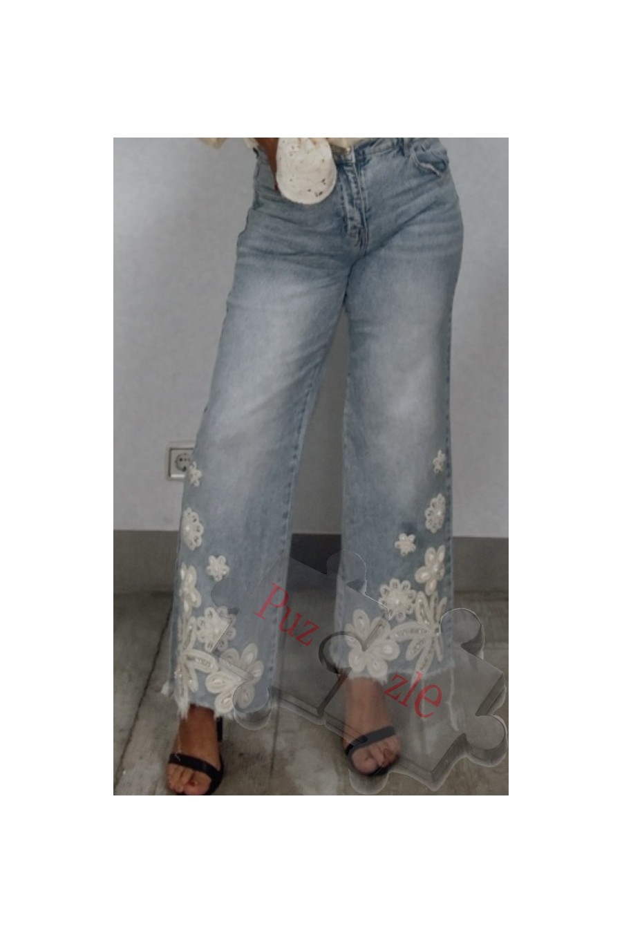 pantalón tejano con detalles de crochet en bajo , disponible en tallas