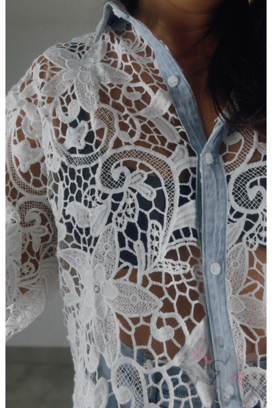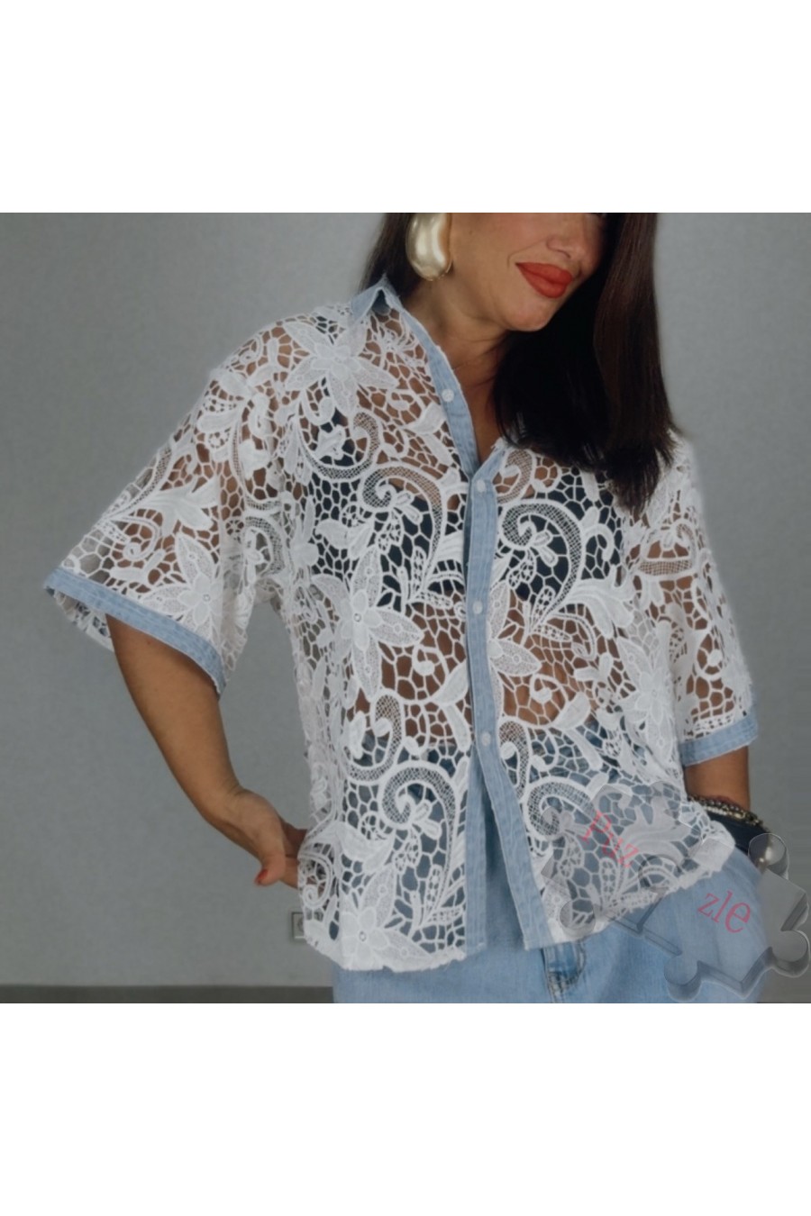 Camisa perforada en tono blanco con tejano , disponible en dos tallas