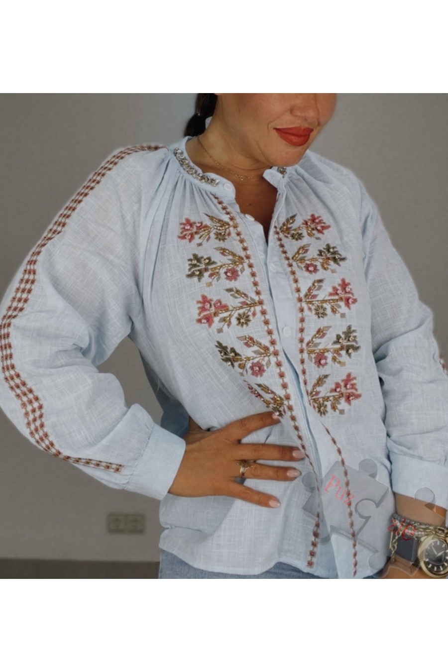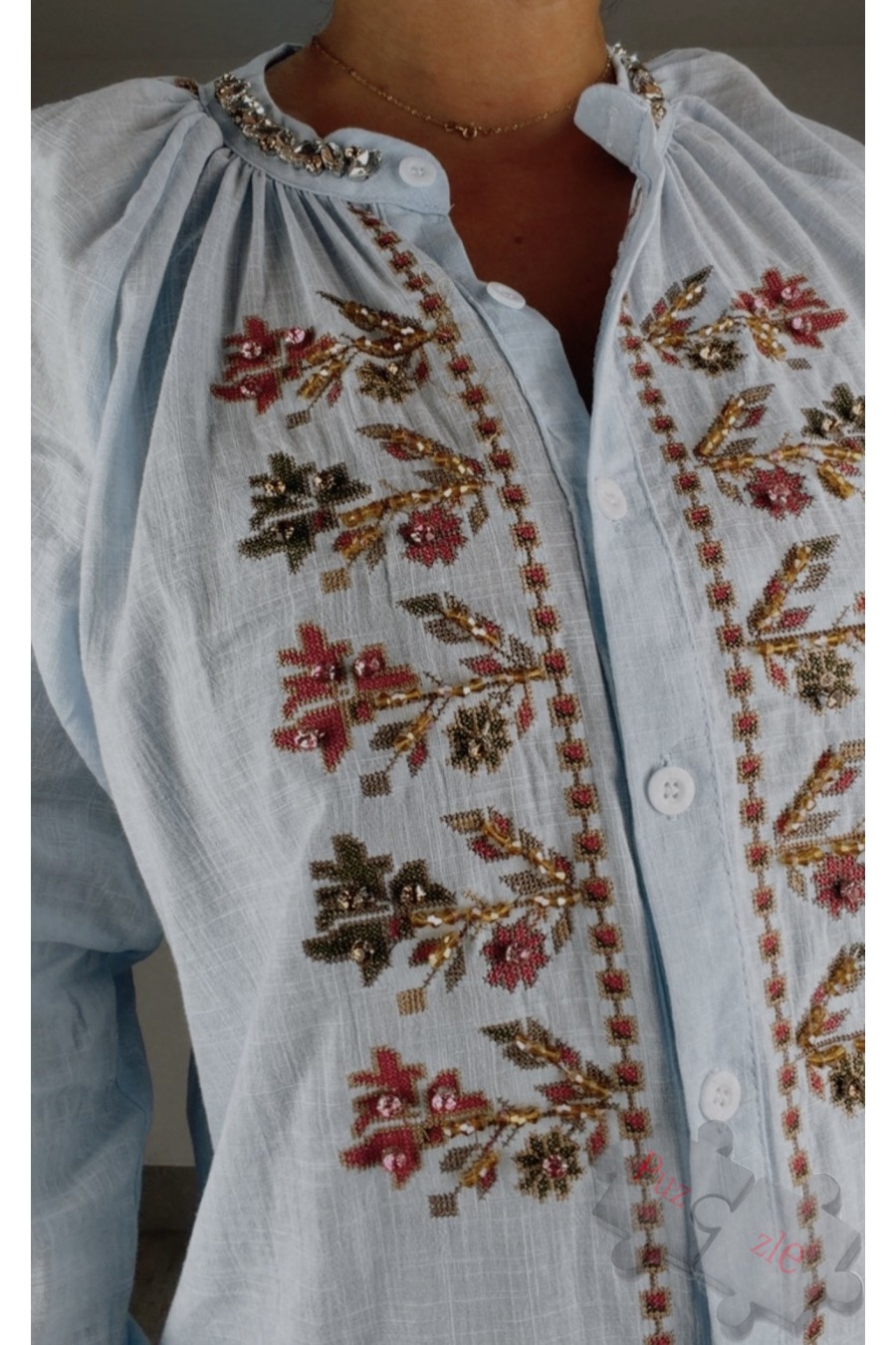 Camisa en falso lino con bordados en punto de cruz y piedras, disponible en talla unica