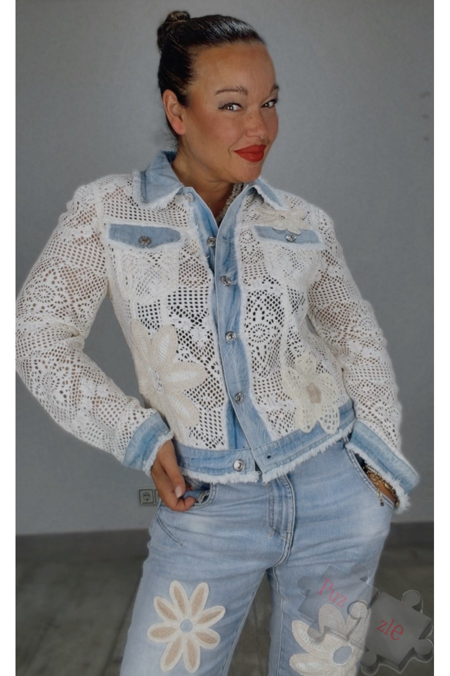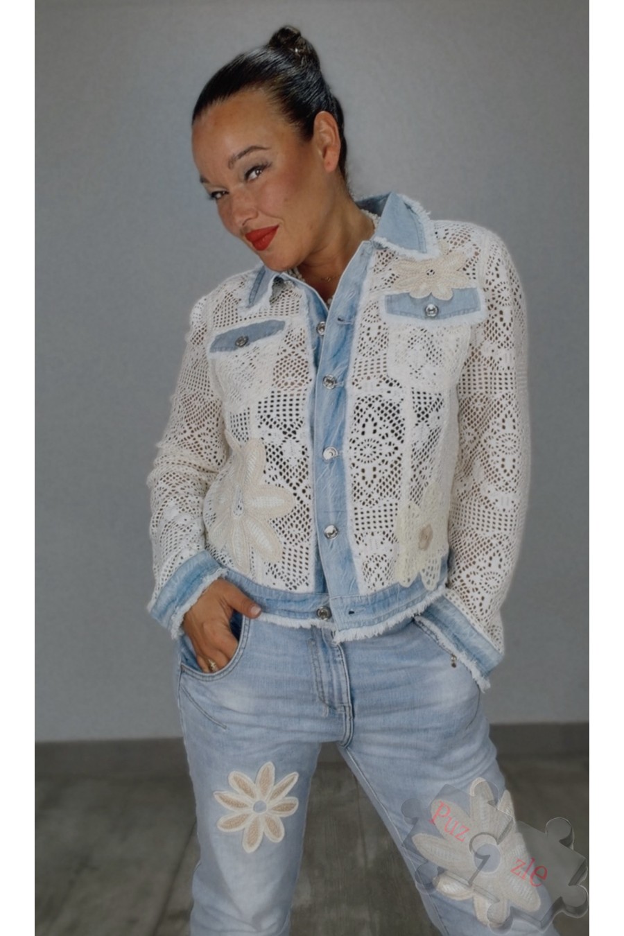 Chaqueta perforada con detalles en denim y crochet , disponible en tres tallas