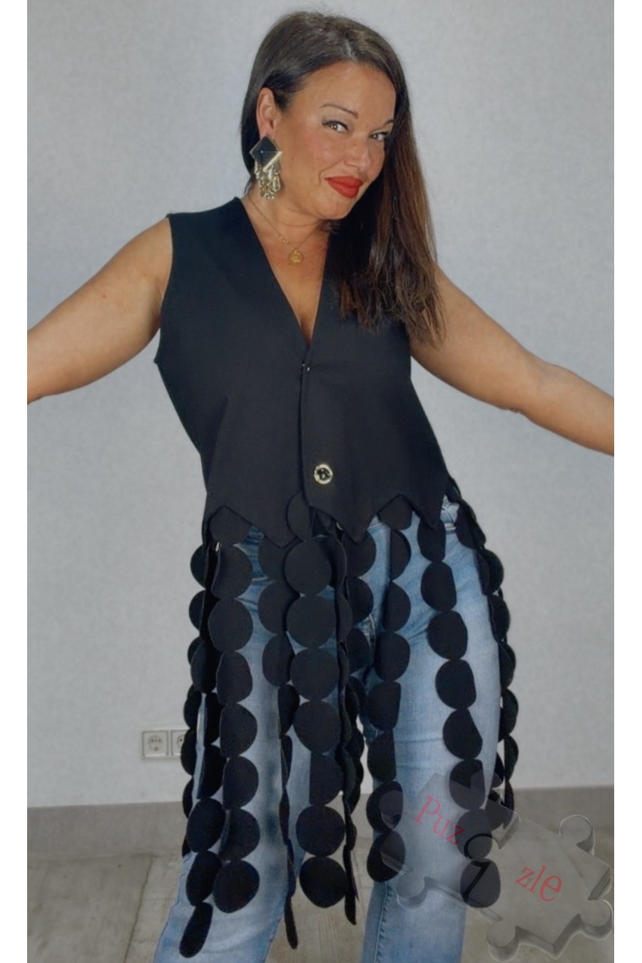Chaleco en tono negro con flecos de círculos , disponible en talla única